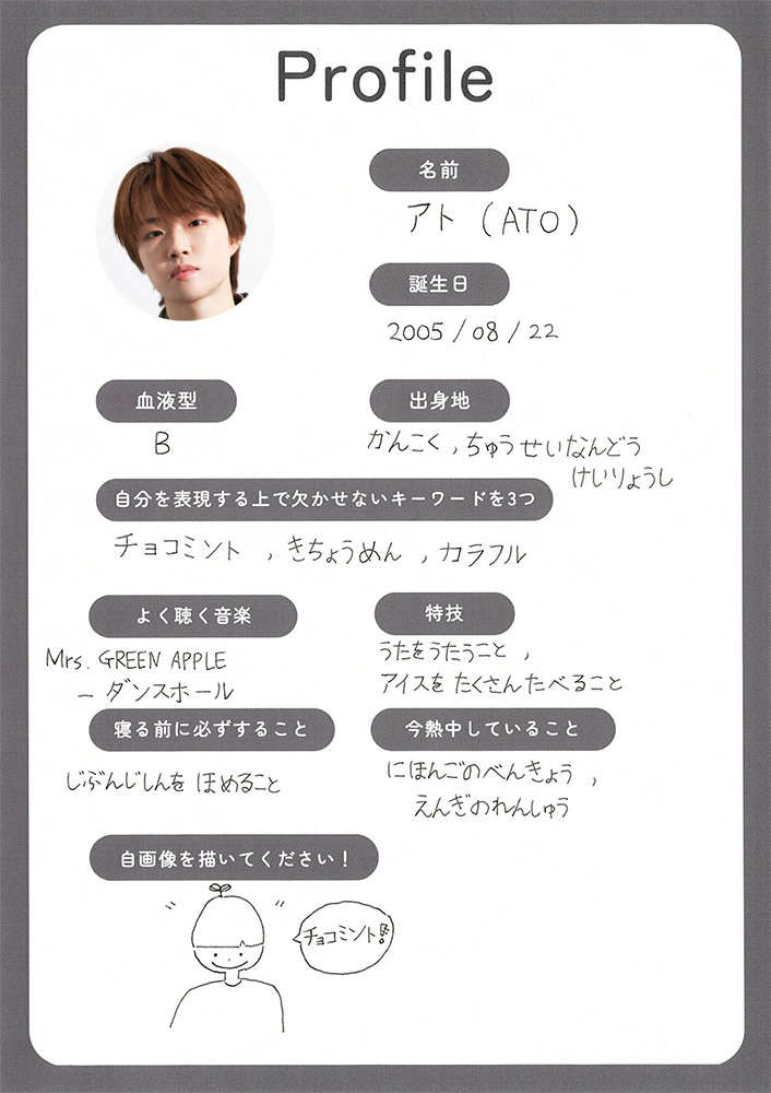 アト:20歳。韓国出身。チャームポイント:清涼感のある歌声