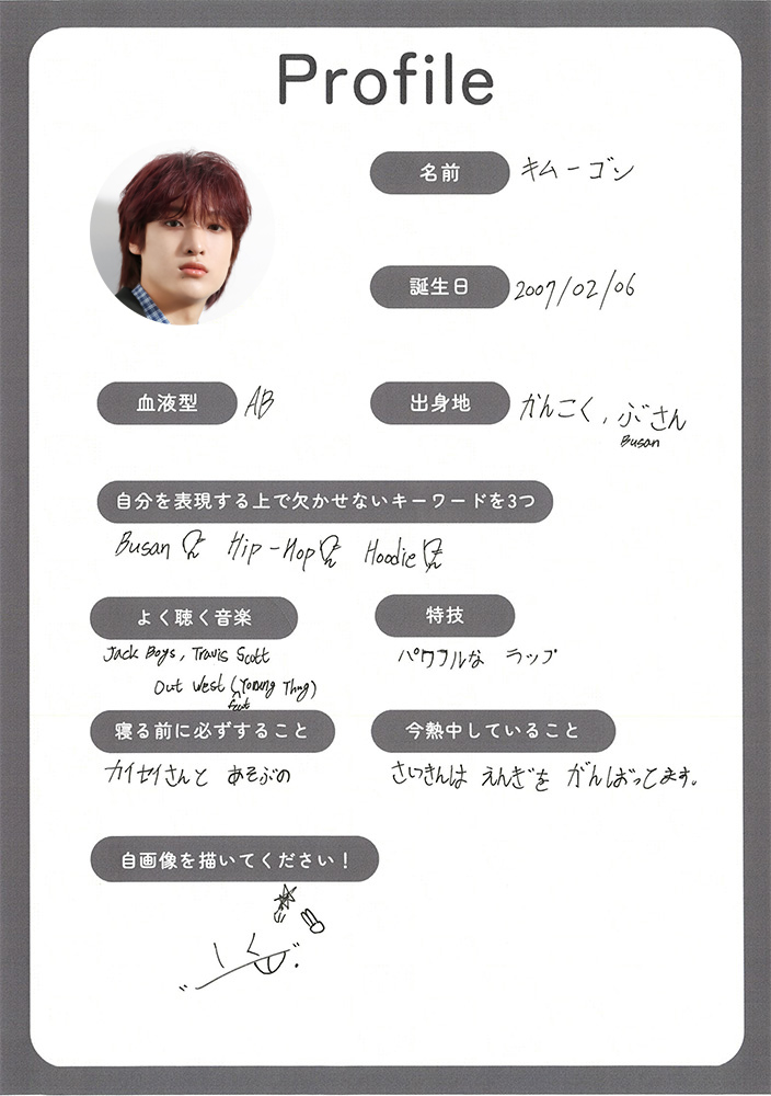 キムゴン:18歳。韓国出身。チャームポイント:パワフルなラップ