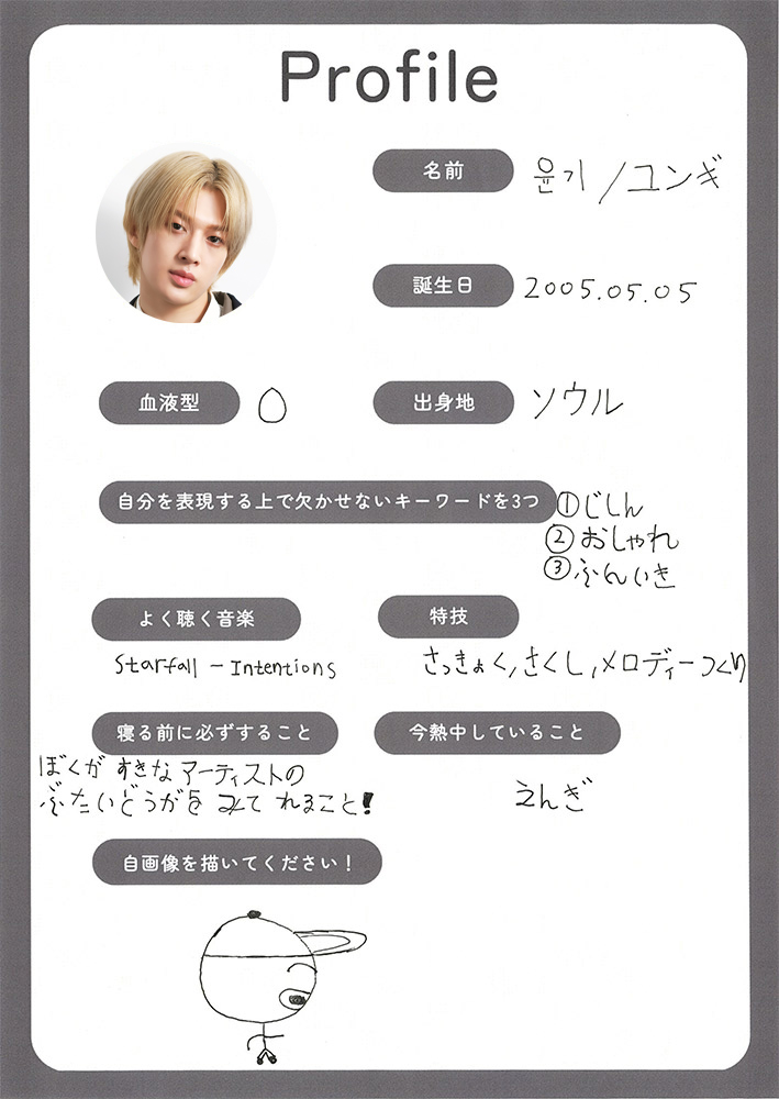 ユンギ:20歳。韓国出身。チャームポイント:明るいエナジー