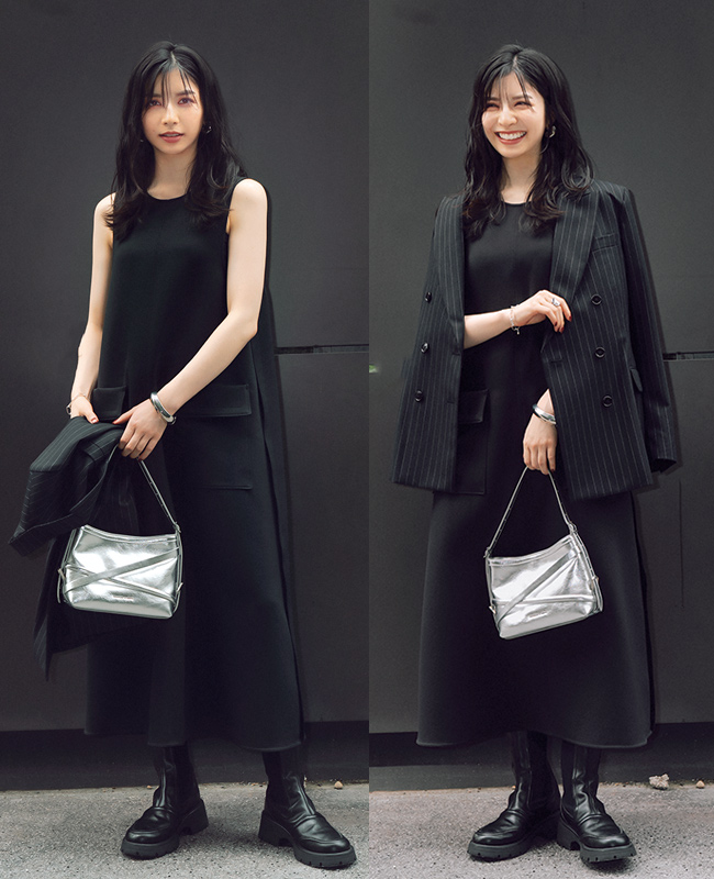 「個性的なデザインも難なくこなせる賀来さん。シルバーのバッグやサイドゴアブーツをプラスして、こなれた洒落感を。」(荒川美保さん)