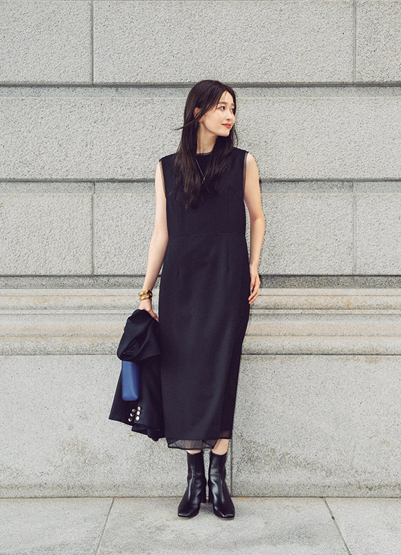 ワンピース¥34,100(ランバン オン ブルー〈ランバン オン ブルー〉) ジャケット¥66,000(エストネーション〈エストネーション〉) バッグ¥12,900(チャールズ&キース ジャパン〈CHARLES & KEITH〉) 靴¥37,400(ALM.) 〝mimi33〟のイヤリング¥3,960・〝アネモネ〟のバングル¥2,970・リング¥3,300(サンポークリエイト) ブレスレット¥37,400(ノジェス)