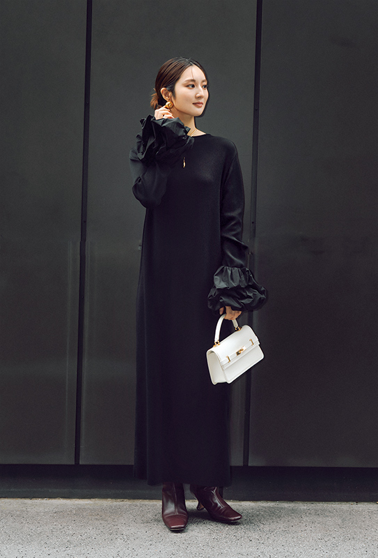 シンプルなニット生地にボリューム袖が目を引く一枚。バックスリット入り。ワンピース¥35,200(HER.) バッグ¥11,900(チャールズ&キース ジャパン〈CHARLES & KEITH〉) 靴¥33,000(ALM.) ピアス¥55,000(エストネーション〈ヴィール〉) ネックレス¥64,350(シエナロゼ表参道ヒルズ店〈SIENA ROSE〉) チョーカー¥7,700(アンティローザ〈loni〉)