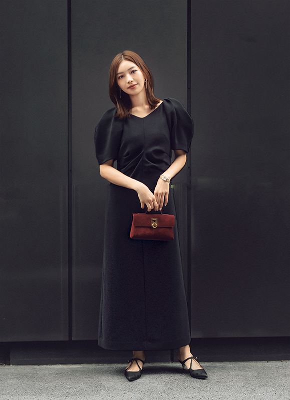 しなやかな落ち感と上品な光沢を備えたストレッチサテン素材。ワンピース¥61,600(ジュンカスタマーセンター〈レルム〉) バッグ¥77,200(カフネ カスタマーサポートセンター〈カフネ〉) 靴¥22,000(銀座かねまつ6丁目本店〈銀座かねまつ〉) 時計¥13,200・ピアス¥4,070(バツリカ) ブレスレット¥36,300(プラス ヴァンドーム〈プラス ヴァンドーム〉)