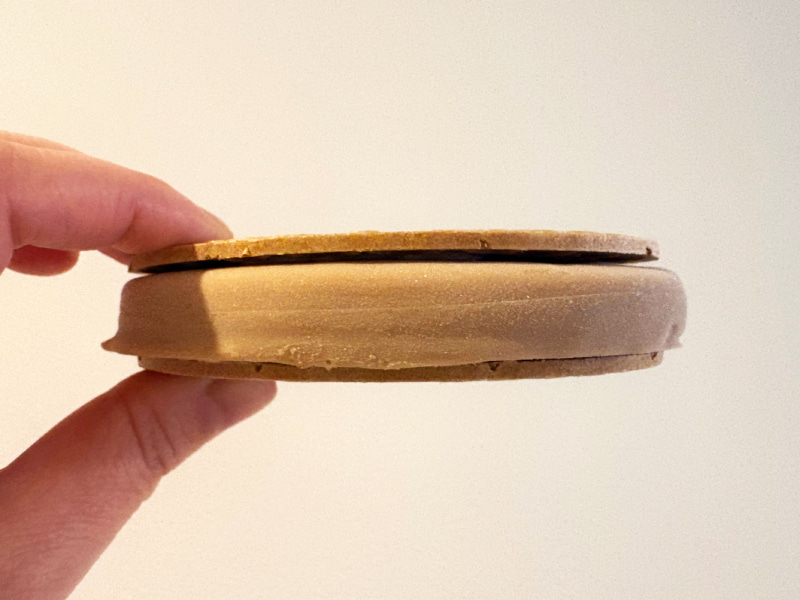 サクサクのウエハース、パリッと割れるカラメルコーティング、このふたつの食感がもう絶妙で、軽やかなのに満足感が高い〝大人のスイーツ感〟に仕上がっています。口の中に、ふわっと広がるカラメルの甘い香りがたまらない…! 幸せな気分にしてくれるクリスピーサンドです。