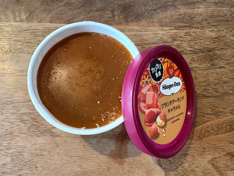 続いては、ミニカップの「クランチアーモンドキャラメル」。とろっとキャラメル×カリカリアーモンドの〝背徳系ご褒美アイス〟です。天面のとろ〜りキャラメルソースが贅沢感たっぷり!