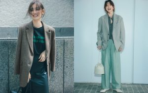 グレージャケットと色のトーンが近い、ライトグリーンのパンツを投入。コーディネート全体のトーンがそろえば、まとまりがよく整った印象になり、きれい色アイテムも大人っぽく決まる。