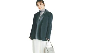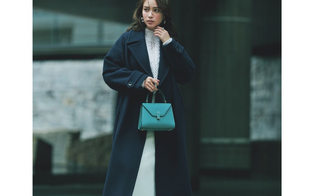 コート¥143,000(インターリブ〈サクラ〉) ニット¥66,000(エストネーション〈コラム〉) スカート¥39,600(オンワード樫山〈BEIGE,〉) バッグ¥594,000(ヴァレクストラ ジャパン〈ヴァレクストラ〉) 靴¥94,600(ネブローニ) ピアス¥69,300・リング¥49,500(ウノアエレ ジャパン〈ウノアエレシルバーコレクション〉)