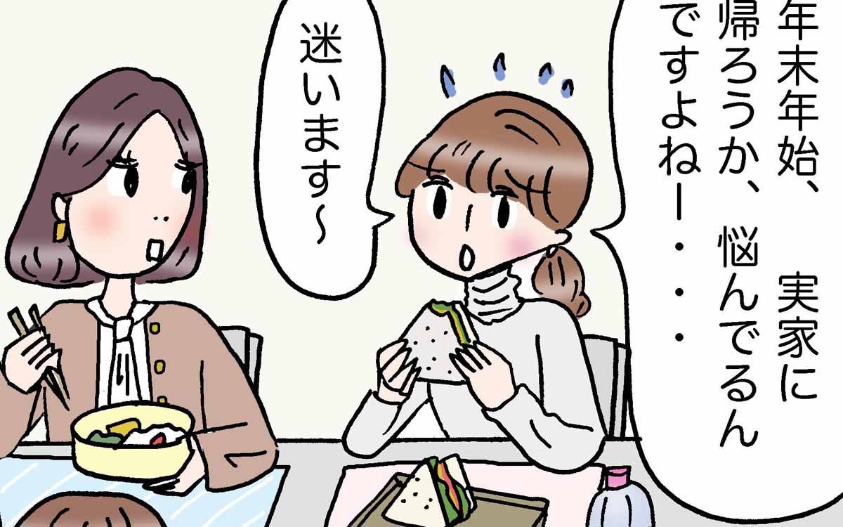 働く女性の“あるあるネタ”を4コマ漫画でお届け。人気イラストレーター・村澤綾香さんによる描き下ろしの毎週土日月の連載です。年末年始は、特別に毎日更新中♡ 今回のお話は、年末年始に帰省を悩む理由。