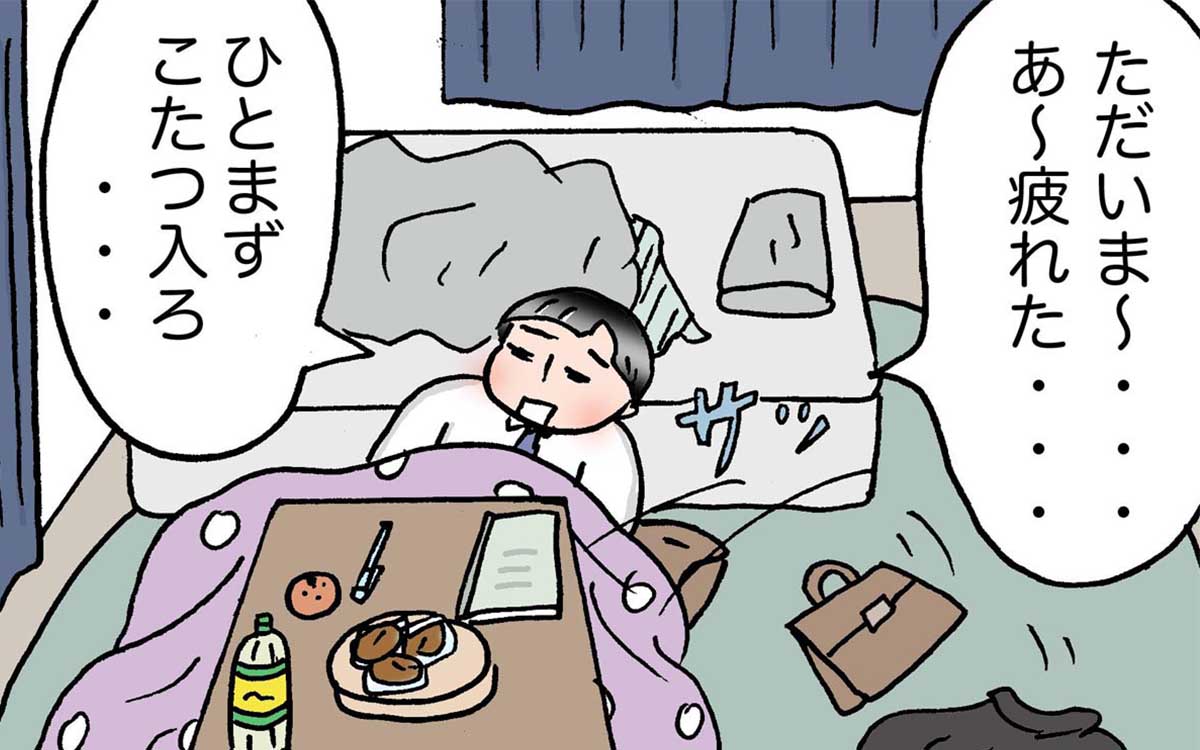 疲れて帰ってきた、一念くん。まずは、こたつに入ることにしました。