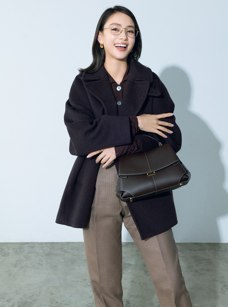 メガネ¥58,300(アイヴァン 7285 トウキョウ〈アイヴァン 7285〉) コート¥64,900(ティッカ〈ティッカ〉) ニット¥25,960(ユナイテッドアローズ 渋谷スクランブルスクエア店〈イウエン マトフ〉) パンツ¥57,200(ボウルズ〈ハイク〉) バッグ¥107,000(ポレーヌ) ピアス¥30,800(プリュイ トウキョウ〈プリュイ〉) リング¥33,000(スクア〈スクア〉)