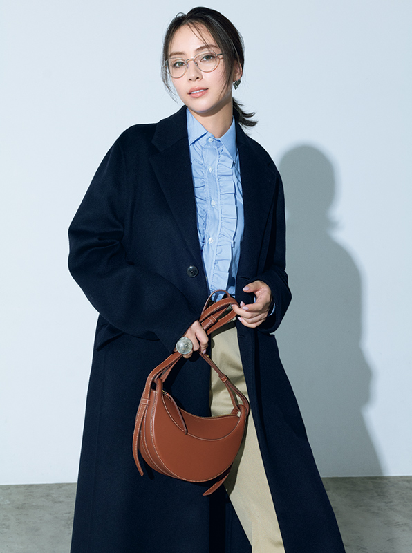 メガネ¥54,780(ルックスオティカジャパン カスタマーサービス〈ケイト×オリバーピープルズ〉) コート¥121,000(エイチ ビューティー&ユース〈ロエフ〉) 〝セブリン〟のシャツ¥62,700・〝アトリエ アンボワーズ〟のベルト[参考価格]¥22,000(アマン) パンツ¥99,000(マディソンブルー) バッグ¥95,000(ポレーヌ) ピアス¥30,800(ノジェス) リング¥36,300(イレーヴ〈イレーヴ〉)