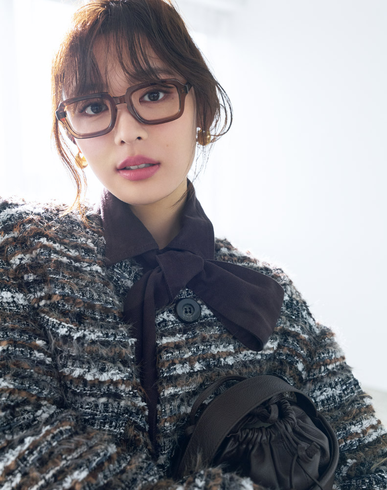 メガネ¥58,300(YUICHI TOYAMA. TOKYO〈YUICHI TOYAMA.〉) コート[共布ベルト付き]¥148,500(エイトン青山〈エイトン〉) ニット¥52,800(インターリブ〈サクラ〉) シャツ¥20,900(カデュネ) スカート¥24,200(ノーブル 有楽町マルイ店〈ノーブル〉) バッグ¥45,100(ヴァジックジャパン〈VASIC〉) チョーカー[2連]¥27,500(プラス ヴァンドーム〈プラス ヴァンドーム〉) リング[2フィンガー]¥16,500(エルディスト ショールーム〈ジャミレイ〉)