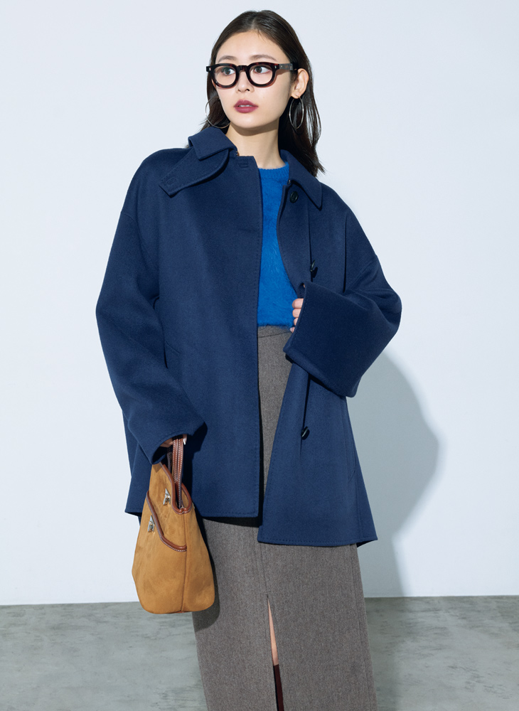 メガネ¥70,400(アイヴァン 7285 トウキョウ〈アイヴァン 7285〉) コート¥132,000・ニット¥72,600(ロンハーマン〈エブール フォー ロンハーマン〉) スカート¥26,400(デミルクス ビームス 新宿〈エーケー ワン〉) バッグ¥52,800(LITTLE LEAGUE INC.〈ア ヴァケーション〉) 靴¥41,800(ル タロン グリーズ ルミネ新宿店〈ル タロン グリーズ〉) ピアス¥106,700(フォーティーン ショールーム〈モニス〉)
