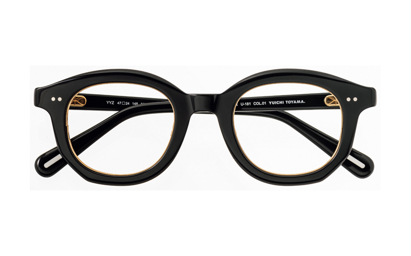 黒フレームとレンズの間にゴールドラインを挟み込み、目元の印象を引き立てる。メガネ/モデル着用と同じ