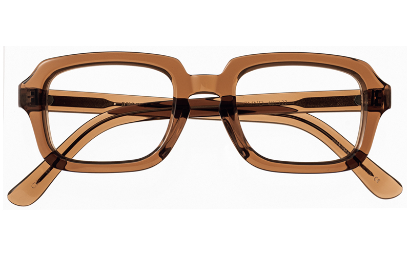 メンズライクなスクエア形の太フレームも、透け感のあるブラウンで女っぽさも感じる一本。メガネ/モデル着用と同じ
