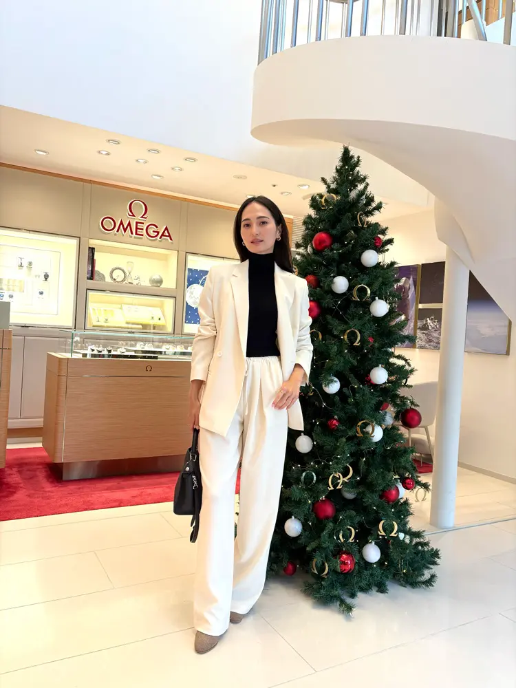 OMEGAブティック六本木ヒルズで出会った新作「シーマスター アクアテラ 30MM」は琴子ちゃんの冬コーデに驚くほどマッチ。ホリデーシーズンのご褒美にも最適です。ぜひブティックで実際の輝きを体験してみてくださいね。
