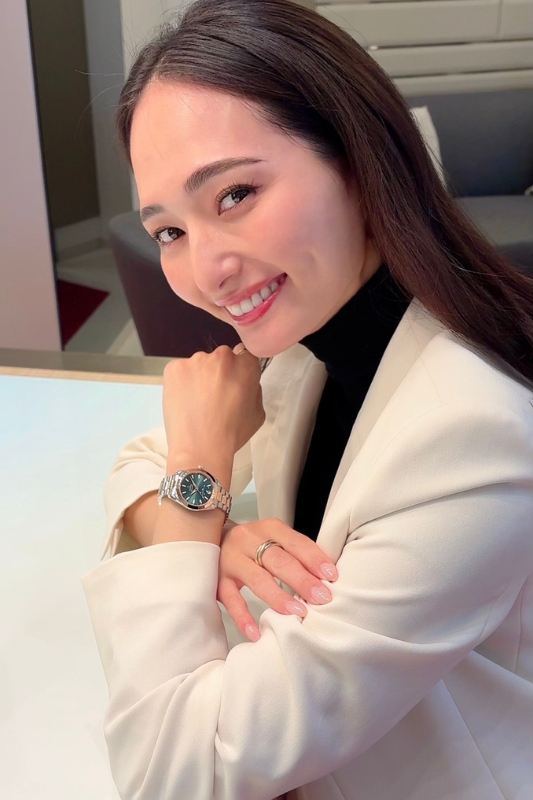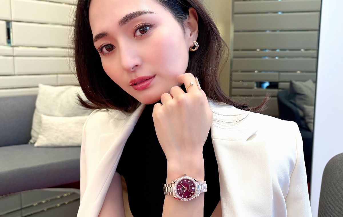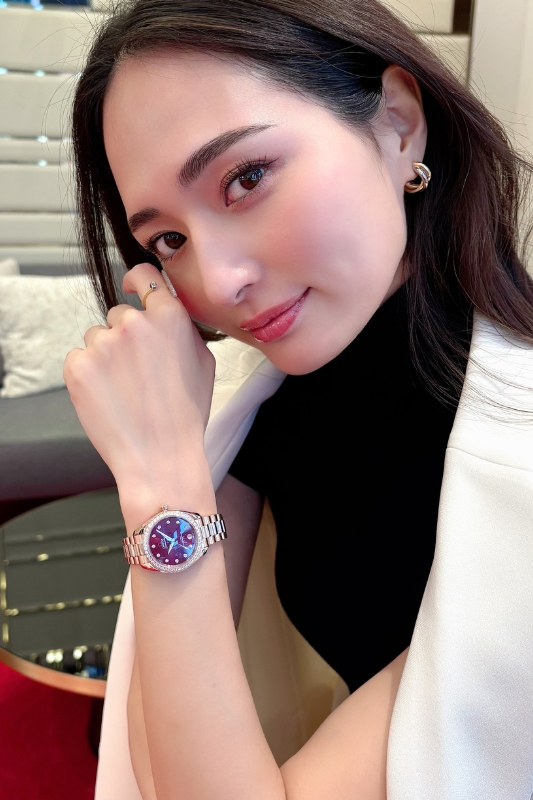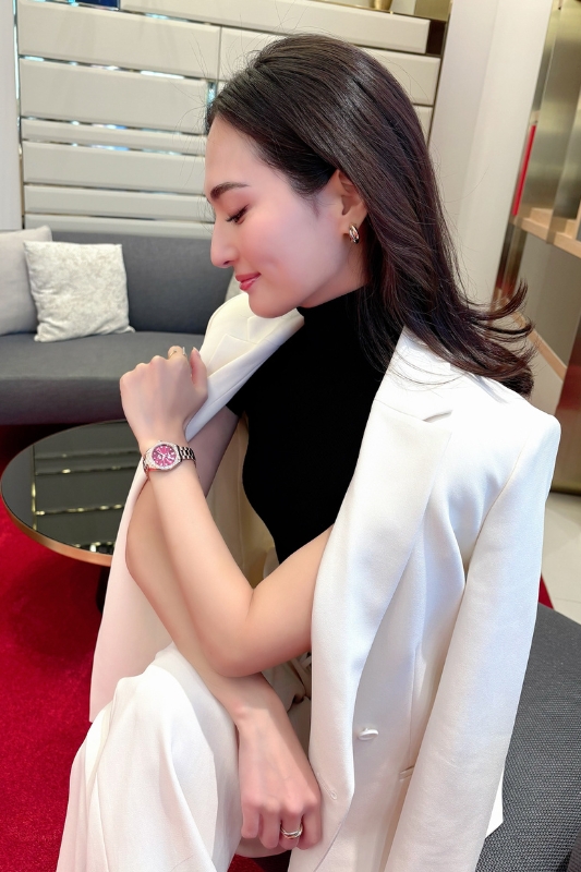 リュクス感漂うバーガンディの文字盤にダイヤモンドインデックスとセドナゴールドのケース。まさにホリデーシーズンの主役級モデル。「繊細なダイヤモンドが手元を動かすたび煌めいて、見ているだけで気分が高揚しますね♡」と琴子ちゃんもテンションが上がっていました。