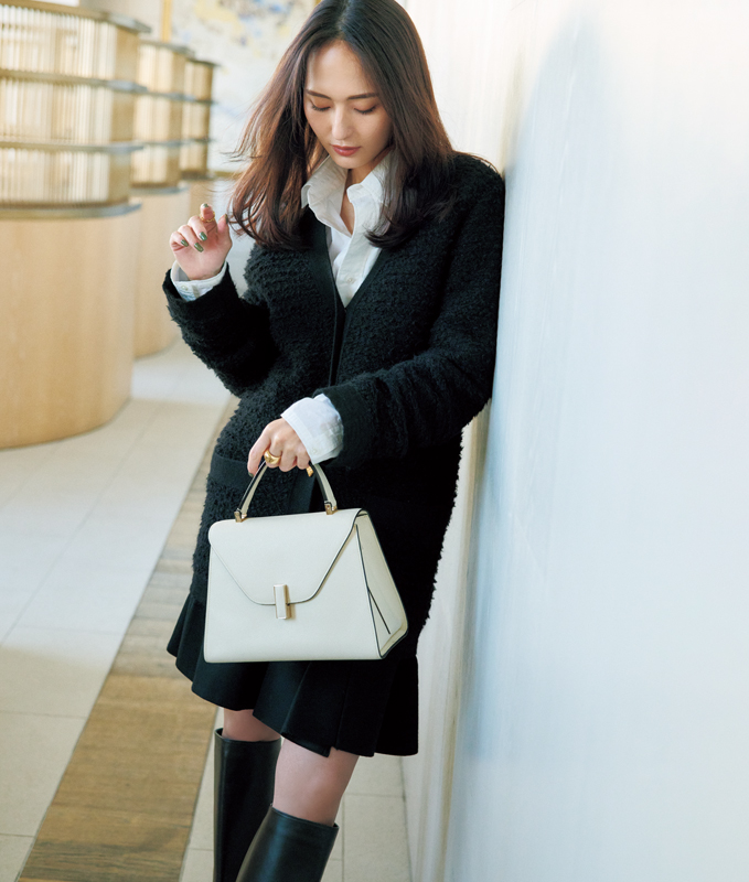 バッグ[ミディアム イジィデ/20×26×12]¥649,000(ヴァレクストラ ジャパン〈ヴァレクストラ〉) カーディガン¥91,300(The Edit store〈ラスパイユ〉) シャツ¥26,400(ティッカ) パンツ¥25,300(カデュネ) 靴¥110,000(ネブローニ) リング[左手]¥23,100・リング[右手]¥13,200(ココシュニック〈ココシュニック オンキッチュ〉)
