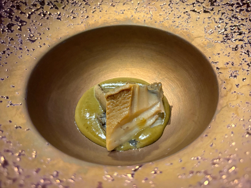 「鮨 KOUMEI」の〝象徴〟とも言える渾身の一皿。フレンチの要素を取り入れた肝ソースは、8キロ分の鮑を水と昆布だけで6時間蒸し上げ、バターを使わずに旨味だけを純粋に引き出しています。鮑の柔らかさと力強さの同居に驚きが! 鮑をいただいた後の、残った肝ソースに赤酢のシャリを入れていただきます。赤酢の酸味と合わさった濃厚な味の深みが、口の中に一気に広がります。