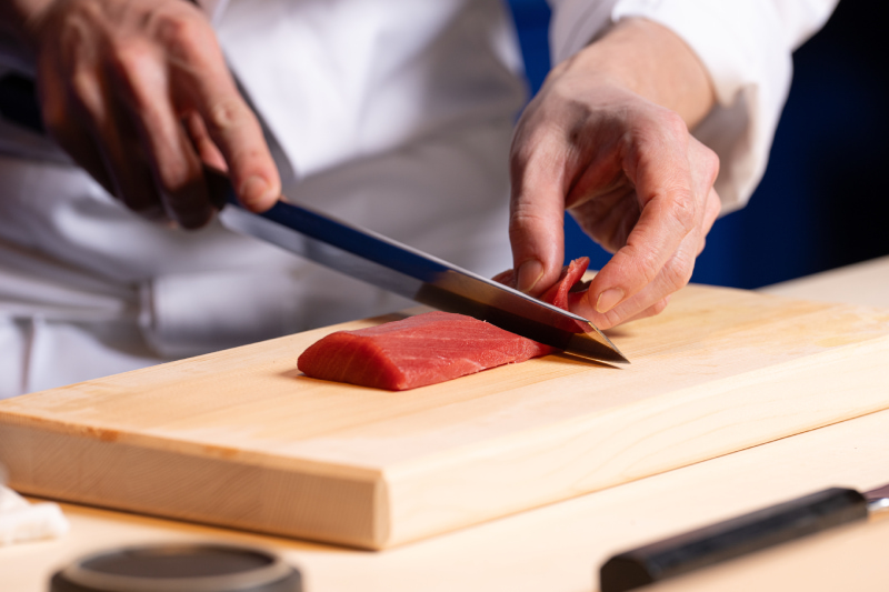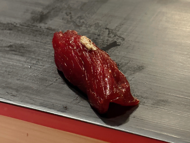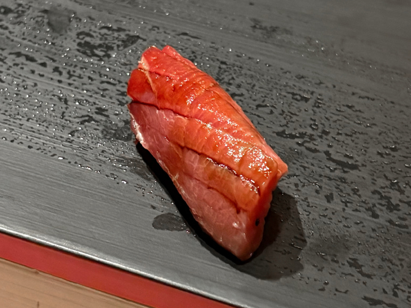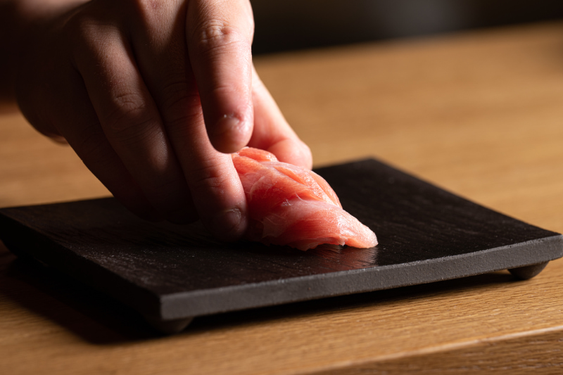 握りのトップバッターは、大間の本マグロの大トロ。内側だけをさっと炙ることで温度を上げ、脂の香りが立ち上がる瞬間をつくり出します。赤酢のシャリと重なり合う旨味のリズムに感動!