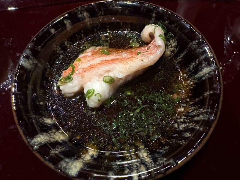 北海道産のきんきを、贅沢に「しゃぶしゃぶ」で! きんき特有の上質な脂が特製ポン酢だしにほどけ、さっぱりの中にもしっかり旨味が感じられる上品なおいしさ。最後は、きんきの旨味が移ったポン酢だしに出汁を加えていただき、余韻までしみじみと楽しみました。