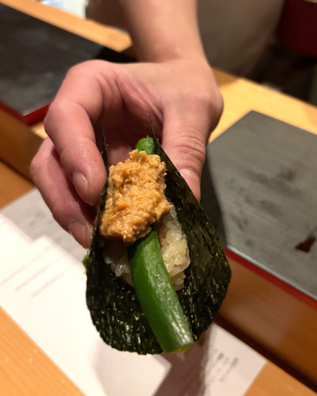 濃厚なあん肝、フレッシュきゅうりの瑞々しさ、奈良漬けの香り。それぞれの個性が、海苔に包まれてしっかりとまとまっています。「飲めるカッパ巻き」と呼ばれているほど滑らかで、鮨の新しい面白さを感じさせる創作巻物です。