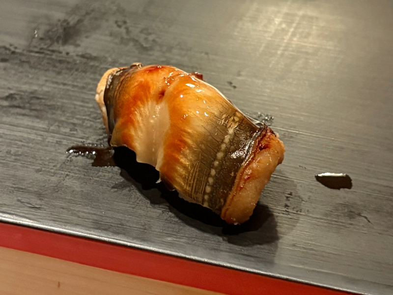 締めの一貫にふさわしい対馬のあなごは肉厚で脂ののりがよく、繊細な味わいと歯応えのよさ、口の中に上品に続く甘みが特徴です。コース全体が静かに、心地よく落ち着いていく瞬間です。