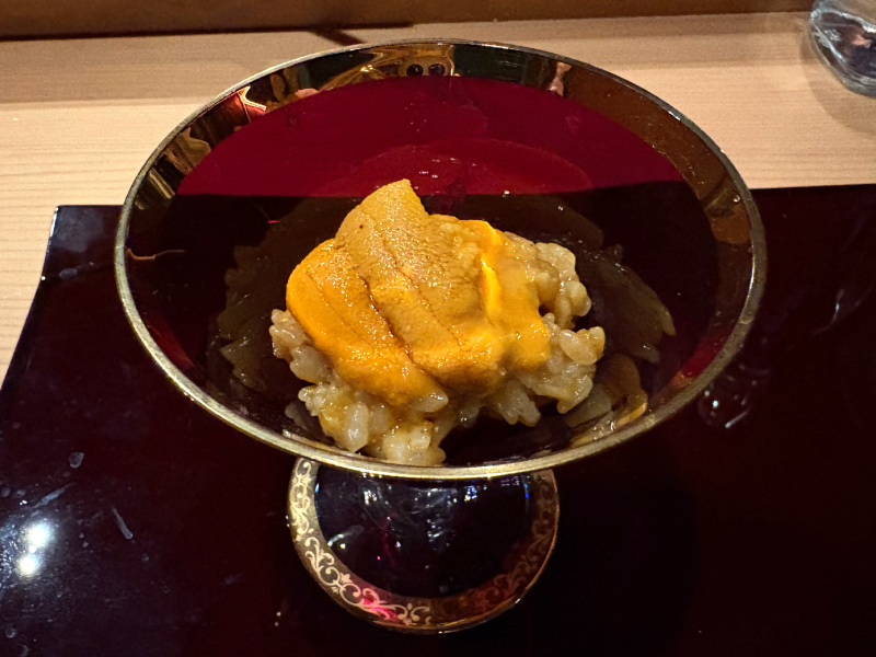 バフンウニの濃厚な甘みに、海の香りがふわり。ムラサキウニのソースがリゾットと溶け合い、鮨という枠を軽やかに越えていきます。