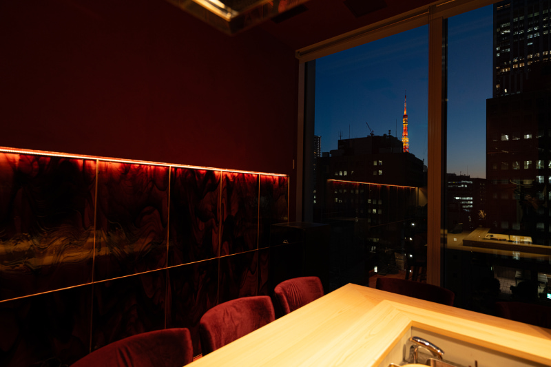 店内はカウンター6席のみ。一斉スタートの2部制。赤を基調とした空間が、余計なものをそっと視界から消してくれます。包丁の音、炊きたての香り、指先の温度が伝わるほどの距離感。〝鮨が生まれる瞬間〟を、ただ静かに見届けられる贅沢。窓の外には東京タワーも! 6席という最小限の空間だからこそ味わえる豊かさがあります。