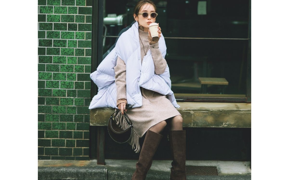 ワンピース¥28,600(カデュネ) ダウンケープ¥33,000(ミフュー) 中に着たシャツ¥24,200(Shinzone LUMINE YURAKUCHO〈THE SHINZONE〉) バッグ¥165,000(J&M デヴィッドソン カスタマーセンター〈J&M デヴィッドソン〉) 靴¥49,500(PIMENTÉ〈PIMENTÉ〉) サングラス¥48,400(プロポデザイン〈プロポ〉) ネックレス¥22,000/ブレスレット¥36,300/リング¥13,200(The Edit store〈アダワットトゥアレグ〉) タイツ/スタイリスト私物