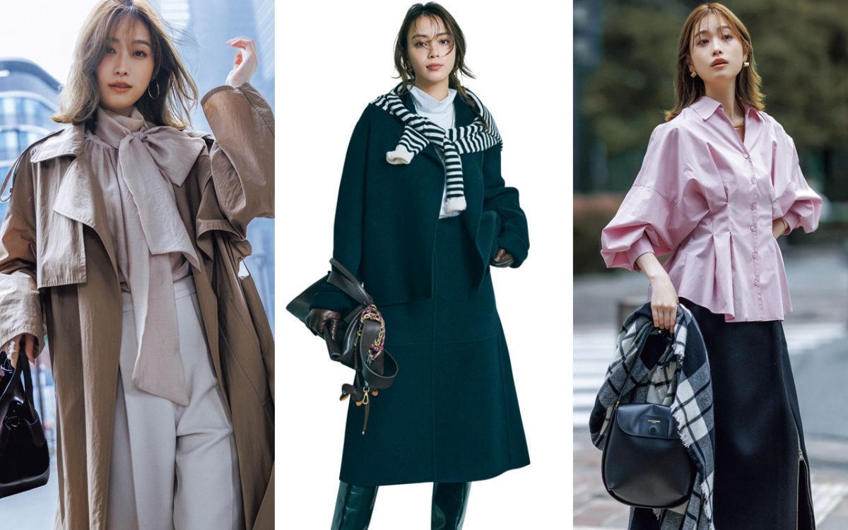 目を引くボウタイはロング丈のアウターからのぞかせるくらいがちょうどいい。〝アウターを脱いだら地味問題〟もこれで解決!