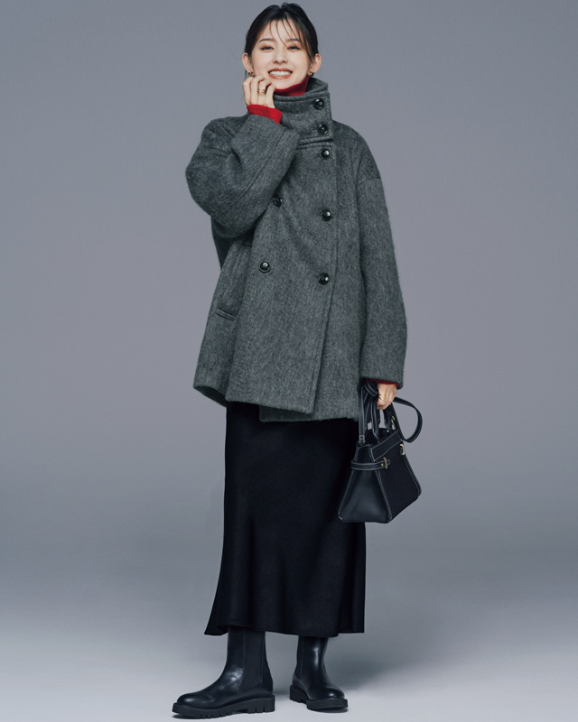 コート¥121,000(エイチ ビューティー&ユース〈ロエフ〉) ニット¥28,600(マルティニーク ルミネ横浜〈レリタージュ マルティニーク〉) スカート¥37,400(インターリブ〈サクラ〉) バッグ¥47,300(ANAYI) 靴¥42,350(ダイアナ 銀座本店〈ダイアナ〉) ネックレス[短]¥147,400(ZUTTOHOLIC〈バルブス〉) ネックレス[長]¥29,700(プラス ヴァンドーム〈プラス ヴァンドーム〉)