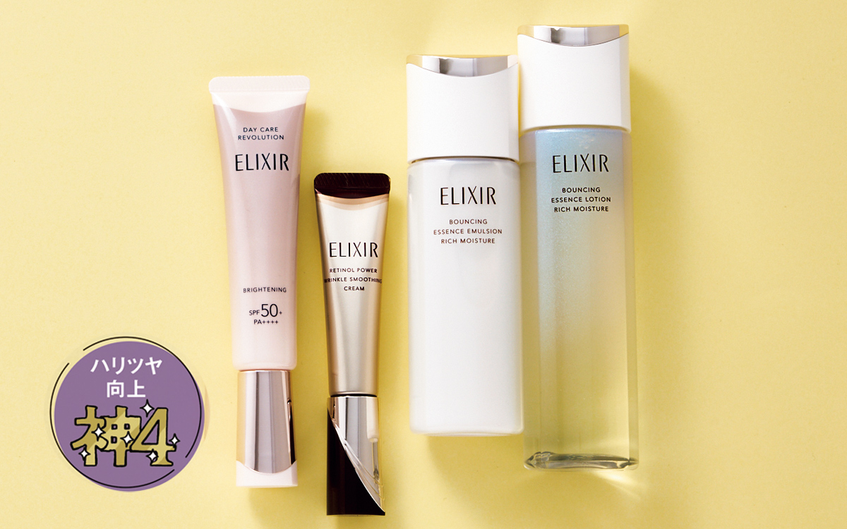 右から/潤いとハリを与え、ふっくらなめらかな肌へ導く保湿ライン。エリクシール リフトモイスト ローション しっとりタイプ ba[医薬部外品] 170ml ¥3,410・同 リフトモイスト エマルジョン しっとりタイプ ba[医薬部外品] 130ml ¥3,960・シワ改善にアプローチする高機能クリーム。同 レチノパワー リンクルクリーム ba S[医薬部外品] 15g ¥6,600・美白×UVカットを叶える朝の名脇役。同 デーケアレボリューション ブライトニング + ba[医薬部外品] SPF50+・PA++++ 35ml ¥3,740(すべて編集部調べ)