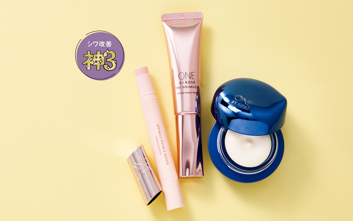 右から/水分保持能もシワケアも託せる、高機能バーム。コーセー ONE BY KOSÉ セラム シールド[医薬部外品] 40g ¥5,940・シワの〝深層〟まで狙い撃ち。日本で唯一肌3層に効く、ライスパワーNo.11+配合。同 ONE BY KOSÉ ザ リンクレス W[医薬部外品] 18g ¥6,380・ナイアシンアミド配合。光効果で夕方の〝老け見え〟に即レスキュー。同 ONE BY KOSÉ リンクル ダブル リペア[医薬部外品] 4g ¥2,970(すべて編集部調べ)