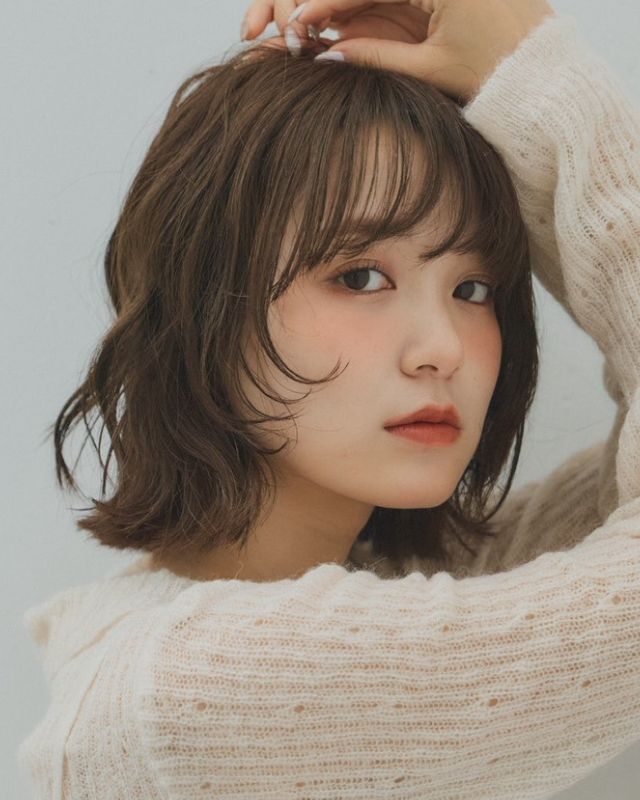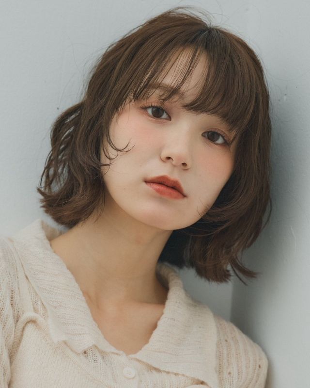 カットベースは、肩につかない長さの切りっぱなしボブ。耳前にレイヤーを入れ、顔周りの動きを出しやすくします。前髪はパーマをかけて眉下になるようカット。