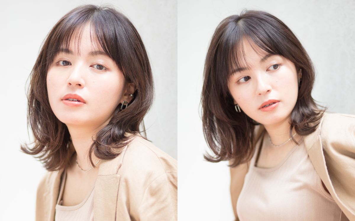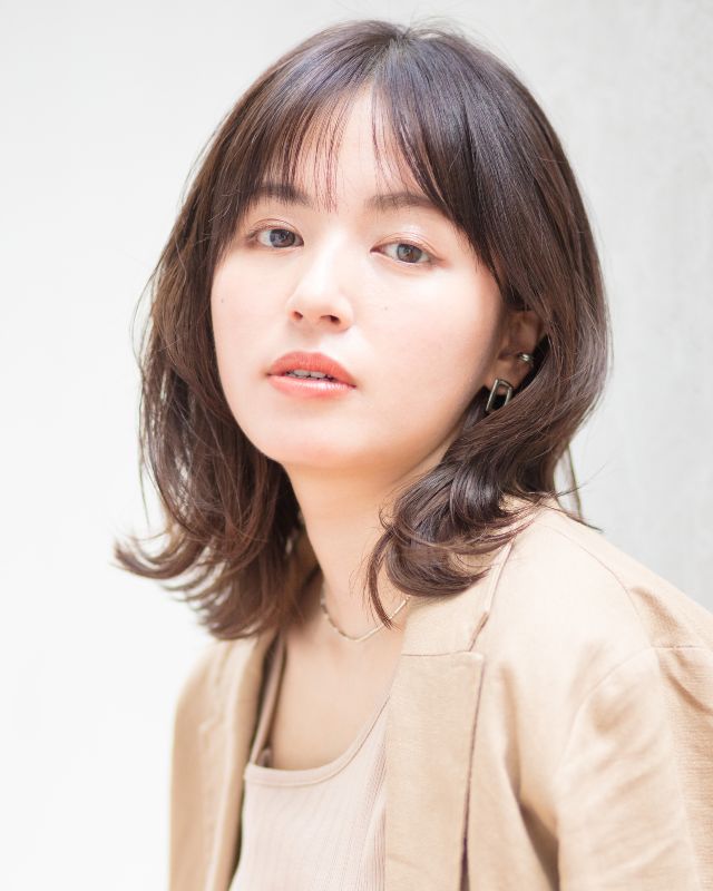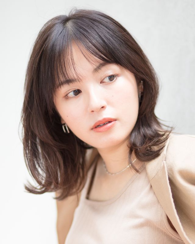 カットベースは鎖骨レングスのボブ。表面に低めにレイヤーを入れくびれ感を出しやすくし、顔周りにも少しだけレイヤーをオン。シースルーバングで抜け感を出し、サイドバングはやや長めでラウンド状にすることで女性らしさをプラスします。