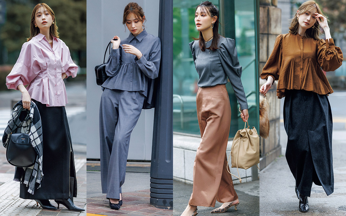 セットアップなら甘くなりすぎずにクールに決まる。ブラウス/上と同じ パンツ¥44,000(フィルム〈ソブ〉) バッグ¥99,000(ヤマニ〈メゾン カナウ〉) 靴¥28,600(ツル バイ マリコ オイカワ) ピアス¥13,200(フォーティーン ショールーム〈サローネ サーティ〉) リング¥17,600(アガット〈アガット〉)