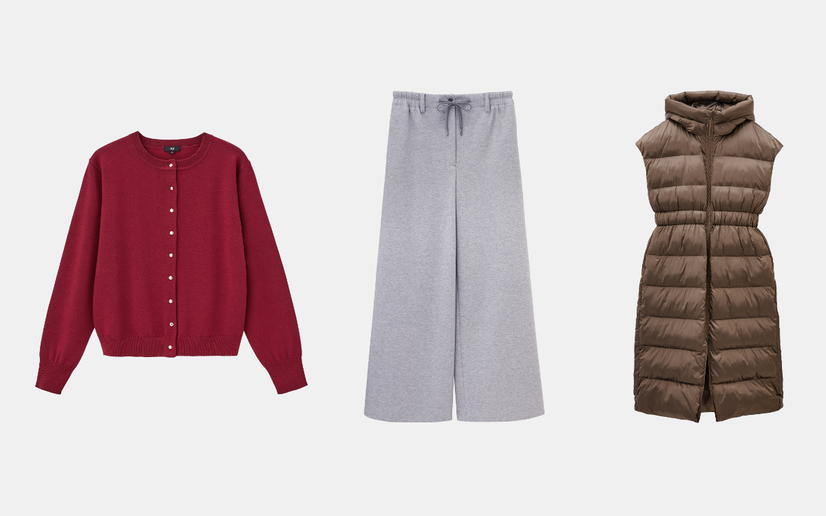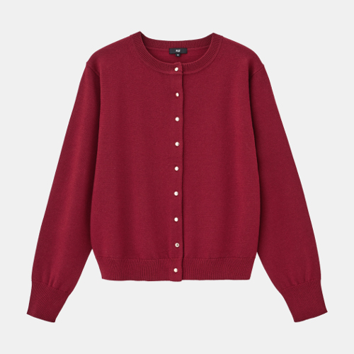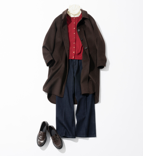 ホリデーシーズンにも最適な深みのあるレッドのカーディガンに、トレンドカラーのブラウンのコートを合わせた、上品カジュアルなコーディネート。インナーには吸湿発熱・保温機能を備えたカットソーを着れば、暖かさもしっかりキープします。