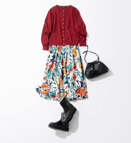 春の気分を盛り上げる、鮮やかなフラワープリントのスカートを合わせたコーディネート。明るいカラーリングを、黒の小物で程よく引き締めるのがポイント。