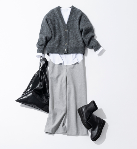 ふんわりした素材感のカーディガンで暖かみを足した、きれいめカジュアルコーデ。素材感の異なるアイテムを同系統の色で統一すると、シンプルながら奥行きのある、大人っぽい雰囲気に仕上がります。