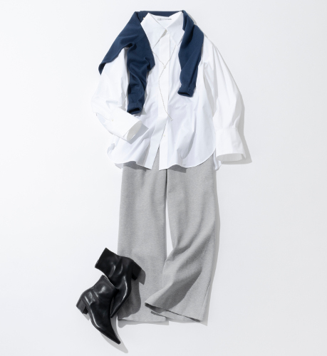 パンツのシルエットがきれいなので、シャツを合わせてもカジュアルすぎず、きちんと感のあるコーディネートに。カラーニットを肩にかけると目線が上がり、スタイルアップに◎。