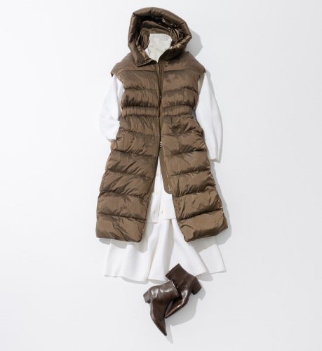 表地には高級感のあるリモンタイースト社のナイロン素材、中綿には東レ開発の高機能中綿を採用した、見た目の上品さと着心地の軽さ、暖かさを全て備えたロングベスト。きれいめコーデにも馴染む程よいAラインのシルエットです。アームホールを広めに設計しているため、どんなトップスともレイヤードしやすいのも魅力。温度調整もしやすく、春先までロングシーズン着用できる、汎用性の高いアウターです。