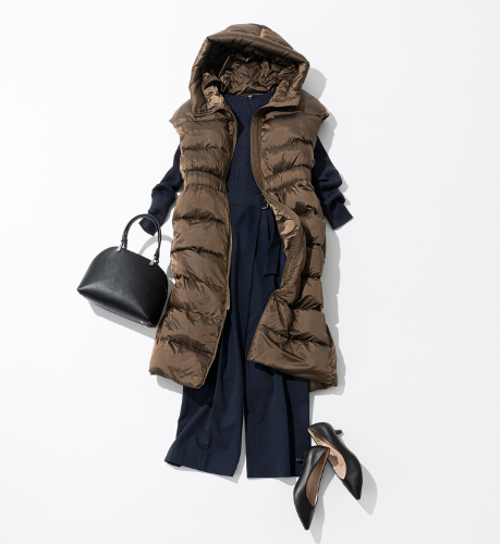しっかりと厚みのあるロングカーディガンと同素材のフレアスカートを白で統一した、冬ならではのホワイトコーデ。ベストの上下どちらからも開閉できるダブルジップ仕様を活かし、Xラインをつくることでスタイルアップも叶います。