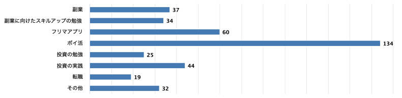 今回のリサーチ結果をグラフで見てみると、トップ3以下は4位に「副業」5位には「副業に向けたスキルアップの勉強」が並びました。