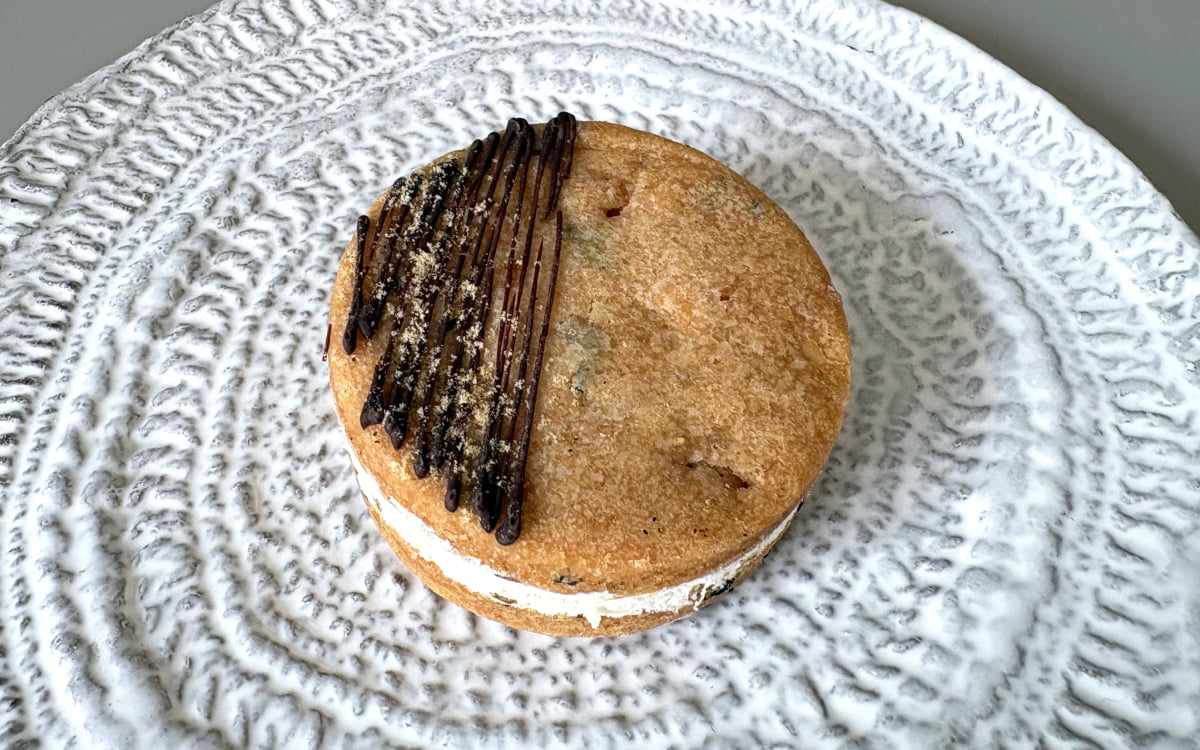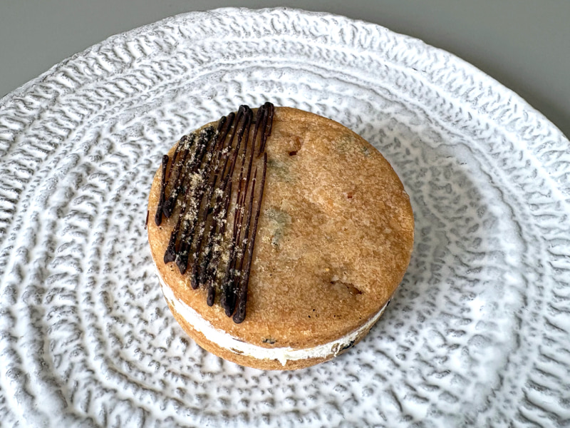 「そいばたーさんど」の第一印象は、小ぶりで繊細、そしてどこか控えめ。ですが、ひと口かじるとその印象が一瞬で変わることに驚かされます。クッキー生地は、なんと小麦粉不使用! 米粉・米ぬかパウダー・丹波黒豆が組み合わさっています。グルテンフリーによる軽やかさと丹波黒豆の豊かな香りが〝軽すぎる〟という先入観を見事に裏切ってくれます。穀物のやさしい甘みが口の中にふわりと広がり、端正な和のニュアンスが漂います。ひと口目からわかる〝丁寧に作られたもの〟のやさしさが感じられます。