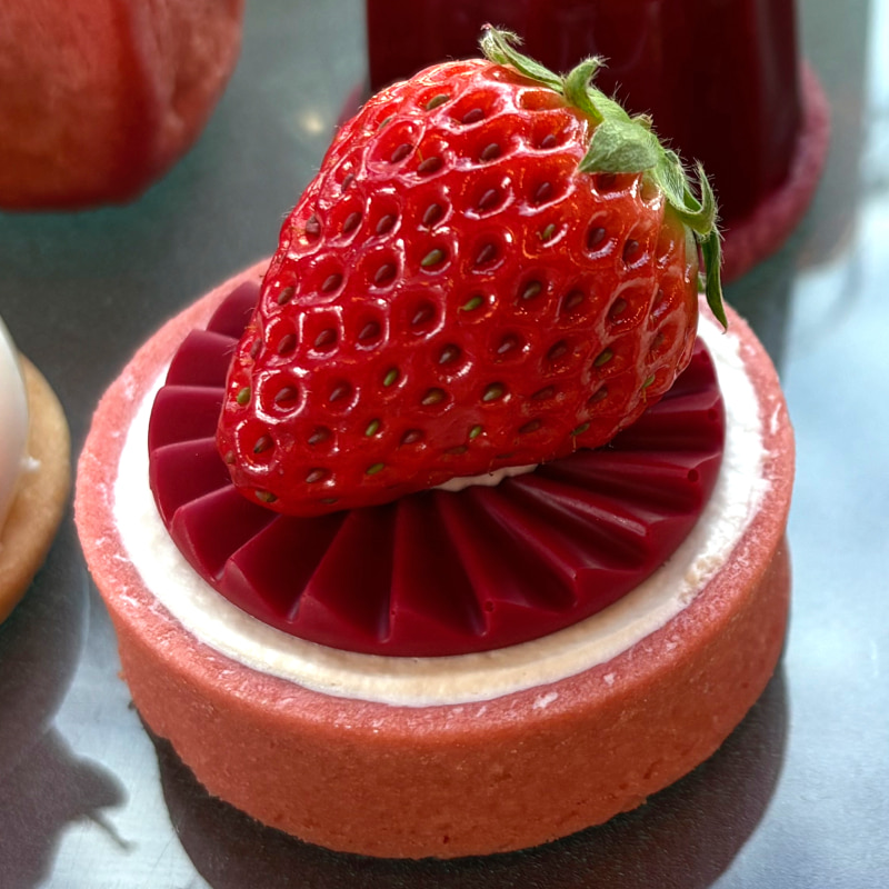 ナッツのコクを感じるガナッシュとオレンジの爽やかさが先に立ち、そこへいちごの甘みが重なります。一口目から、酸味と甘さの全体の完成度の高さを実感させてくれるタルトです。