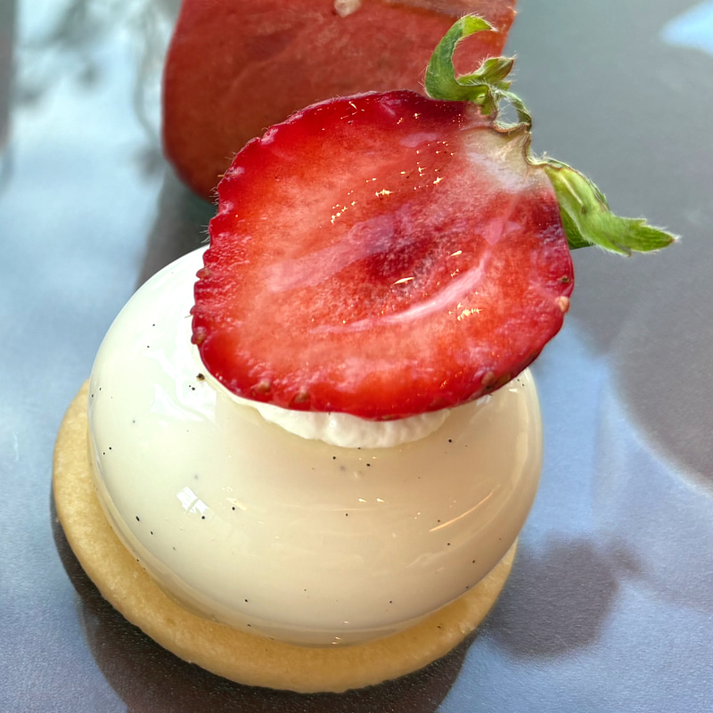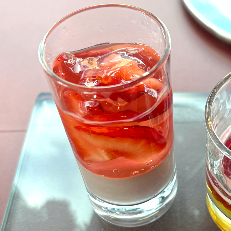 果実感のあるいちごゼリーを、タヒチ産バニラのムースで包み込んだ、やわらかな一品。なめらかさの中に、クッキーの食感がアクセントとして効いていて、軽やかさと満足感のバランスが絶妙です。