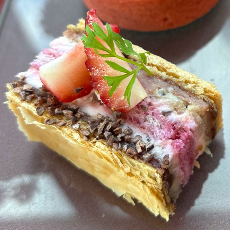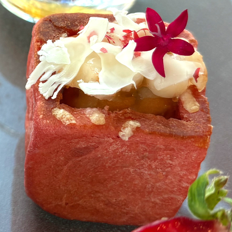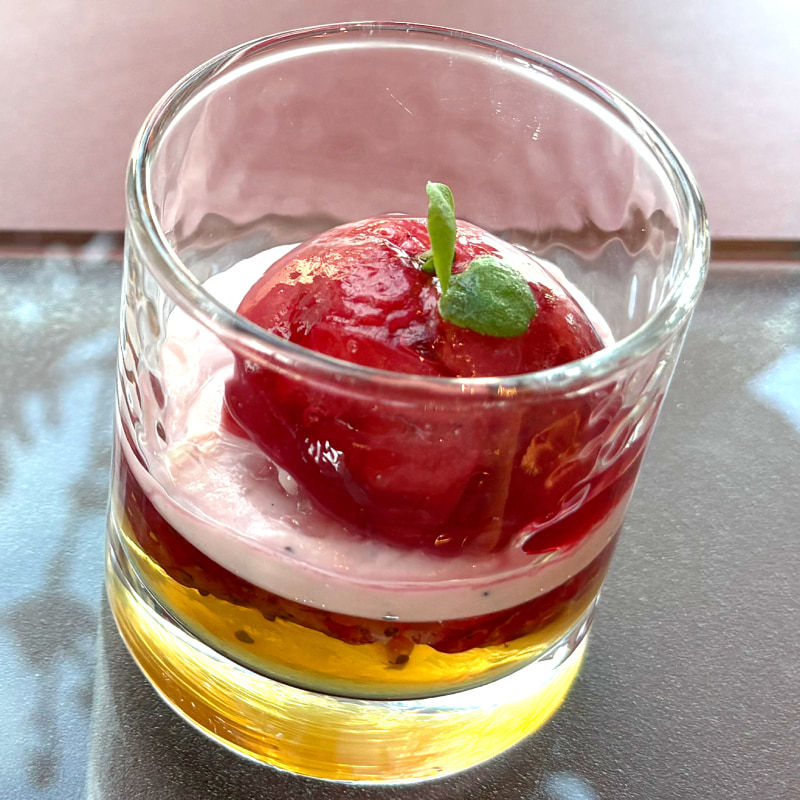 鴨の生ハムに、いちごジャムとカカオ豆を重ね、キャラメリゼしたピーカンナッツで食感をプラス。甘味・塩味・ほろ苦さが時間差で広がり、「いちごをこう使うのか」と驚きが。楽しいサプライズ感のあるセイボリーです。