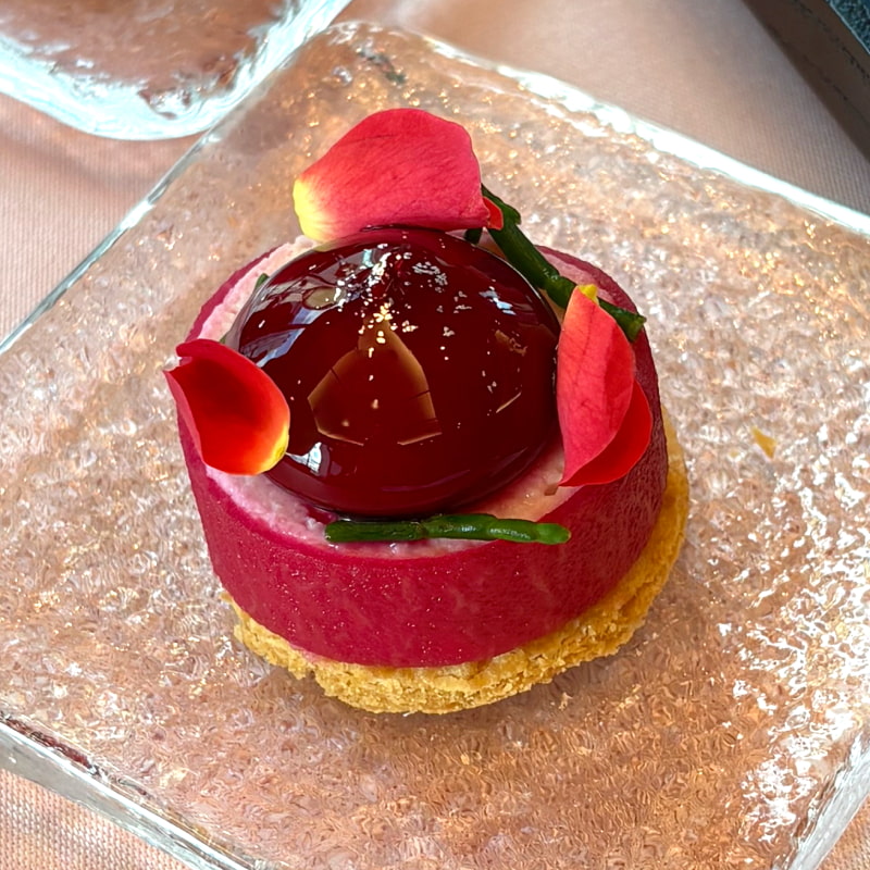 帆立のムースに、ココナッツカレーのゼリードームを重ねて新鮮な味わいに。口に入れた瞬間に広がる旨みと、後から立ち上るバラの香りが印象的で、特別な時間にふさわしい余韻を残します。