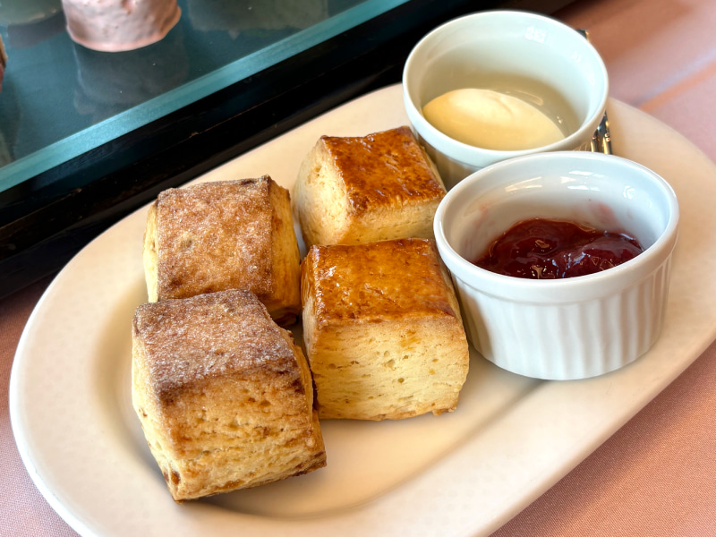 焼きたての香りがふわっと広がるスコーンは、アフタヌーンティーの醍醐味。クロテッドクリームといちごジャムという定番の組み合わせが、心をほぐしてくれるような安心の味わいです。